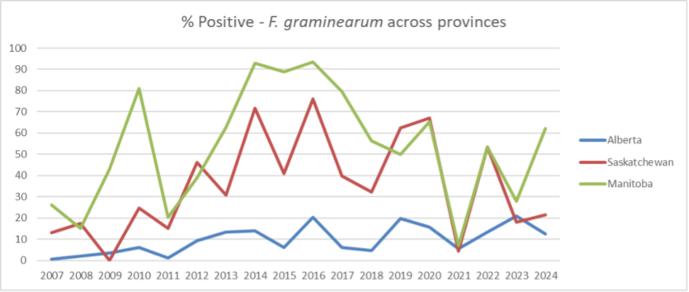 While Alberta’s % of positive samples decreased since last year, Manitoba and Saskatchewan have seen increases (Figure 2). Manitoba has had 62% of samples test positive for F. graminearum. Saskatchewan remains at a relatively low level, at 22%, compared to the average over the last decade which is 44%.